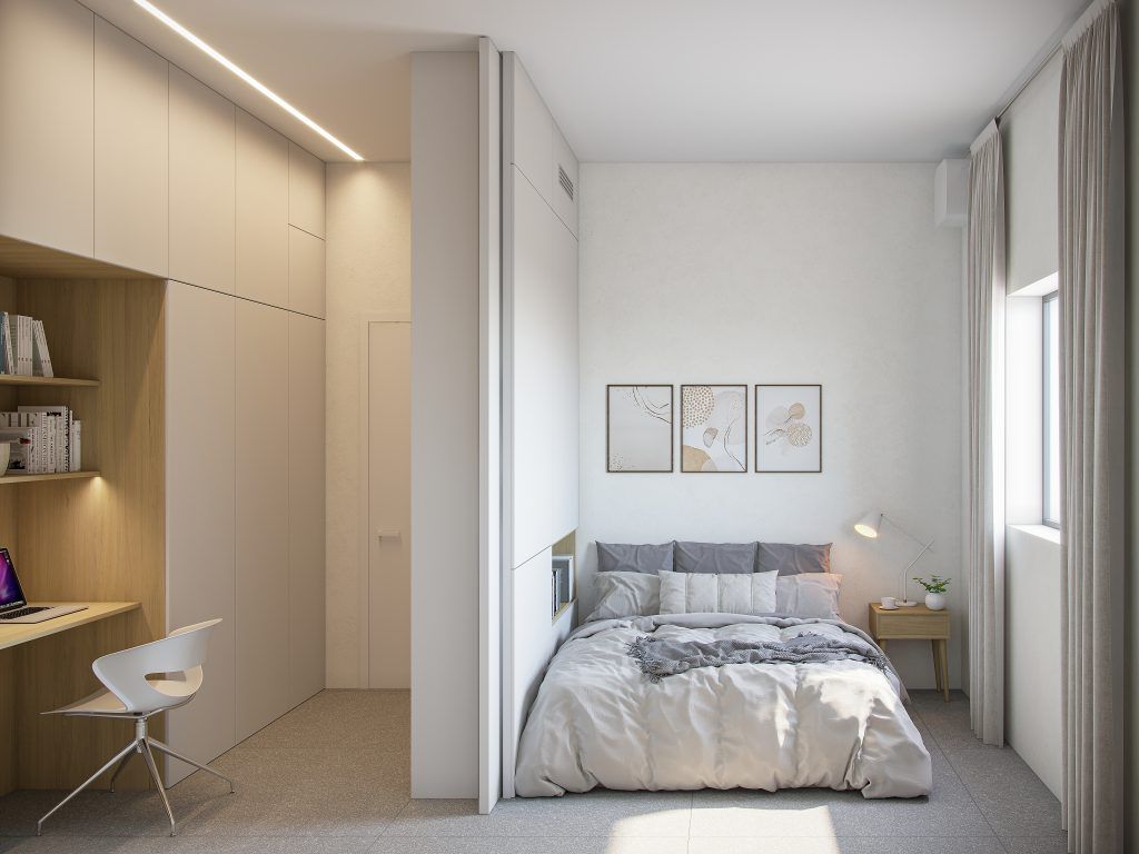 The area of the apartments ranges from 42-82 square meters, and their interior planning, which was entrusted to Studio XS, which specializes in the design of compact apartments, including overlaps between spaces, waiver of corridors and unique carpentry items adapted to each type of apartment. The studio has created several programs of choice that allow maximum adjustment to the lifestyle and needs of the tenants, and they eliminate the need for an interior designer or commissioned carpentry works, saving a significant part of the budget. Part of the design also includes the manufacture of packaged furniture items like a folding dining table, or a workspace embedded in a cabinet. These create a sense of space and provide a response