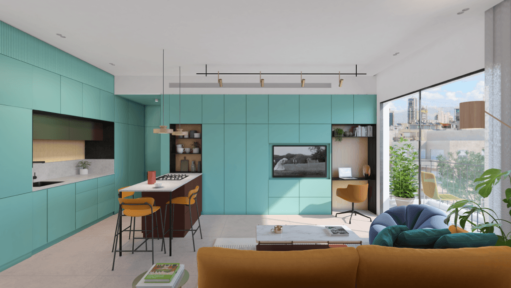 רהיט טלויזיה משולב באי מטבח. בונסאי הדמיות